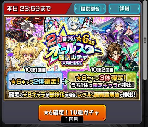 ついにオールスター感謝ガチャがやってきた!1回目は★6確定が2体!いっけーーーっ!(コナンくん) オニキスとバーソロミュー。どっちも初GETだぜ!バーソロミューってクマの絵ついてるけど、ワンピースのバーソロミュー・くまと関係あるのかな? 2回目は★6…